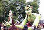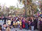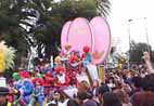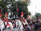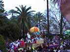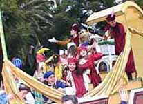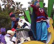 | 夕方5時ころからReyes magosが街を行進し、 キャンデーを配ってまわります。 子供も大人もそれを、跳んだり跳ねたりし ながらキャッチ。 私も10個ほど。。。 |  白人のレジェス。 みんなにキャンディーを投げている。 | |
