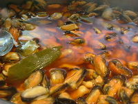 | さて次はワインに行くかな。しっかりめにするかフル-ティ-でいくか。 リオハにしよう。「リオハのお薦めを!」 Deme vino tinto de Rioja recomendable,por favor. Riojaらしい柔らかな香りのリオハボルドン・クリアンサをどうぞ。 少し注いでみるキレイな色だね。ほんとだ香りもふわっとしてるね。 これにあわせてム-ル貝の白ワイン蒸しとトルティ-ジャ・デ・パタタでもつまむか。 NEW ム-ル貝の白ワイン蒸しこれからの春・夏はにんにく・唐辛子でパンチを利かせてます。 辛口の白ワインと最高ですよ。 |