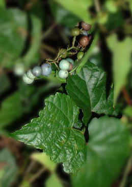 ノブドウ(野葡萄)ブドウ科開花時期:8月 撮影:11月初めて見た物なので、はっきりそうなのか自信がないのですが、おそらく名前合ってると思われる。 この写真ではかなりわかりにくいと思いますが、どうかご勘弁。 実は白から青、紫と様々な色をし、目を楽しませてくれるが食用にはできない。 なお、他のに比べ実が膨れている物があったら、それは「ブドウタマバエ」が寄生した「虫えい」です。 それ系が苦手な方は要注意。 (それを知っていたためにこの撮影の際も植物に触れまいと遠くから撮った。) チャンスがあったらもう少し実が色んだ所をゲットしたいです。もちろん、植物に触れれる様装備万端にして、、、。 |