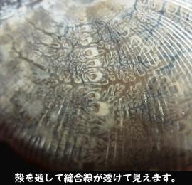 平べったいボディに、ほとんど点のへそが特徴で、全体に細い条線があります。住房部は普通ほとんど残っていません。保存の良いアンモナイトは、表面の薄皮を通して縫合線が透けて見えますが、このアンモの場合、平べったいボディのおかげで、それがとりわけ美しく見えます。