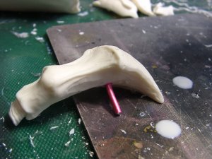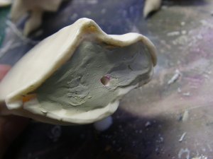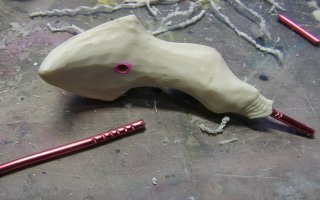 エポパテ盛ったコンバーター接合部です。 パテが硬化する前に上の画像の基部パーツを押し付けて位置合わせ 硬化後に再び外すので、基部パーツのほうにはリップクリームを離型剤代わりに塗ってあります。 そのまま硬化後剥がして、マーカーの跡に接合用の穴あけ |