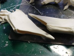 | 全パーツ バリ取りとパーティングの処理を済ませて簡単に仮組みw済ませてから軸打ち開始です 表面ペーパーかけるし、作業中手で触るし 離型剤落しは最終段階でやります。 ほとんどのパーツは位置合わせようにダボが付いてるので、凹のほうはそのまま2.5mmのアルミ線に合わせて穴あけ、凸のほうは一端けづり落してから同様に2.5mmで穴あけ 抜け防止の為にアルミ線にニッパーで傷をつけてます。 |