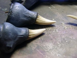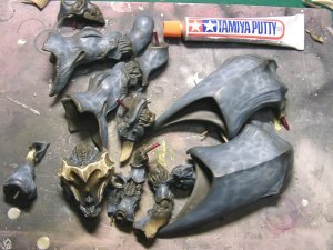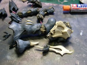 かなり薄めの塗料で塗膜も薄くしてあるので、 フクラハギのフィン?やツノ、ツメ、関節等 溶剤を含ませた筆で塗料を洗い落とすと簡単にキャスト地が露出します。 マスキング嫌いな人にお勧めの方法(笑) 溶けた塗料はある程度拭き取りますが、境界部分に残ったものは気にせず放置 |