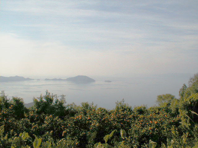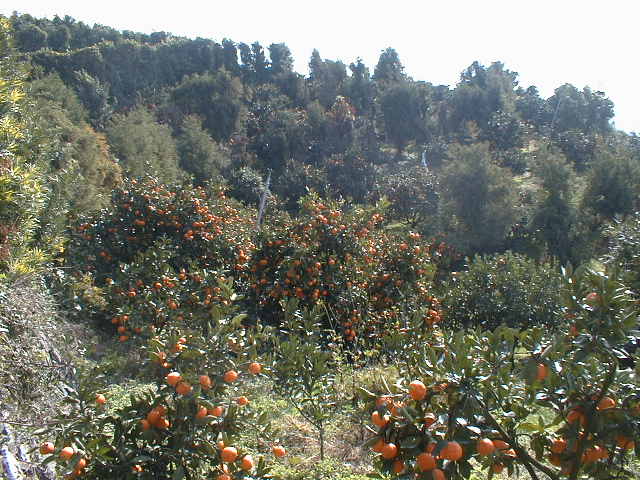 八幡浜では、果実栽培が盛んで、中でもみかんは明治の中頃から栽培が始まり、現在では全国でも有名な産地となっています。急な斜面を利用した段々畑を埋めつくすみかんの木々は、眺めも壮大です。 |