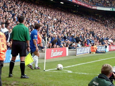 | プレミアシップ、チェルシー(Chelsea)のホームゲームで、当日券があるとの情報を聞きつけ、急遽チェルシーの試合を見に行くことにしました。 チェルシーもフルハム(Fulham)と同じくロンドンをホームにし、今住んでいる場所からかなり近いです。有名どころでは、デサイー(Marcel Desailly)、ジャンフランコ・ゾラ(Gianfranco Zola)、ハッセルバインク(Jimmy Floyd Hasselbaink)などがいます。チームも常に上位におり、ファンも熱狂的で、試合開始前なのに野太い声で歌い続けているのにはちょっとビックリ。そんなファンのおかげで、雰囲気は最高です。一方のバーミンガム・シティ(Birmingham City)は、ロンドンに次ぐイギリス第2の都市バーミンガム(Birmingham)をホームとし、・・・それ以外知りません(^_^;)。 |