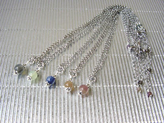 ネックレスです。(アジャスター付き) 8mm丸玉 ラブラドライト(ブルーグレー)調和・穏やかな心・記憶 ブルーカルサイト(ライトブルー)意識・豊かな感受性 カイヤナイト(ブルー)潜在能力・創造力を発揮 ムーンストーン(ピンク)女性らしさ・感受性・喜び・調和・決断力 モスコバイト(ワイン)緊張や束縛からの解放・自由な発想 |
