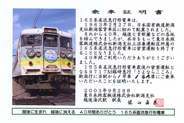 その直後に運転された臨時急行「さよならこころ」(越後湯沢→新潟)を最後に営業運転を終了した。
