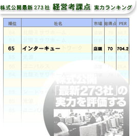 株式公開最新273社経営考課点実力ランキングでインターキューが65位にランクインされました。