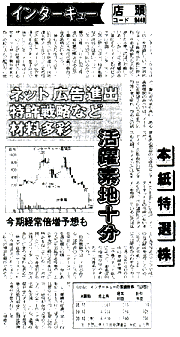 ネット広告進出 インターキュー(9449・店)を見直したい。世界的なインターネット株波瀾の波に押され、株価は高値から大幅に下落した水準で底ばいが続いている。しかし、足元業績の高い変化率やドメイン取得ビジネスの好調、インターネット広告分野への進出、特許戦略など評価点は高い。ファイナンス(6月13日払い込みで公募32万株)後の需要悪化懸念はあるが、中期的に大きな活躍が期待できる銘柄といえよう。 もっとも大きな注目点はネット広告分野への本格進出。同社は大手メールマガジン業者などと提携し、メールに広告を掲載するビジネスを子会社で展開している。メールはユーザーの手元に直接届けられるため、ユーザーの興味をあらかじめ絞り込んだ配信が可能で、費用効率も高い。ある調査期間の調べでは、メール広告市場は2005年までに73億円まで膨れ上がるとの試算もある期待の大きなビジネスだ。 ドメインの取得代行ビジネスも好調。ドメインとはwww.kabusiki.co.jpなど、インターネット上の住所ともいえるもので同社は世界のドメインを管理している公式団体ICANNよりアジアで唯一の公式認可を取得している。同社の「お名前.com」サービスは開始わずか7ヶ月ですでに2万4000件の登録を獲得。「今度のネット拡大によって、加速度的な増加が見込まれる」(外資系アナリスト)という。 特許戦略では、同社が有する一部特許のライセンス供与を開始した。「データベースを基に個人の嗜(し)好にあう広告を出稿する技術や、広告を表示し続ける技術などの特許を有している」(会社側)といい、「今後増加する無料プロバイダーの大半が該当してしまう可能性もある」(準大手証券アナリスト)もの。今後はこうしたライセンス収入の増加も期待できそうだ。 足元業績も好調。第一・四半期(1〜3月)は売上高が14億900万円(前期比96%増)、経常利益が3億600万円(同2.1倍)と高い変化率を実現している。通常経常利益のアナリスト予想は12億〜16億前後と前期比倍増水準が予想されている。(せめぐ) |