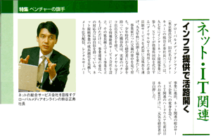 事業家だった父親の背中を見で育ち、少年時代から経営者になる夢を待っていた熊谷氏は、実家のパチンコ店店長などを経て、ダイヤルQ2による情親提供サービス会社を設立。その廷長線上でネット事業を立ち上げただけに、事業環境の変化への対応力には自信を持っている。ネット接続事業の成長鈍化を見越し、メール広告配信、レンタルサーパー事業に進出、ネット関連の総合サービス企業への変身を急ぐ。