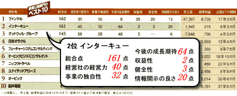 | ・経営者の経営力 (点数は1位10点、2位8点…5位2点) …経営戦略の的確さ、リーダーシップの強さ、 発想の柔軟性・大胆さ ・事業の独自性(同上)…事業内容そのものが新しい、あるいは他社と違う事業展開の仕組みがある ・今後の成長期待(同上)…今後5年程度の成長性の高さ ・収益性 (点数は1位5点、2位4点…5位1点)…利益率の高さや効率の良さ ・健全性(同上)…財務体質の健全性 ・情報開示の良さ(同上)…ディスクローズ資料の記載内容や決算説明が 十分かどうか、情報開示が必要な時に適切になされているか |