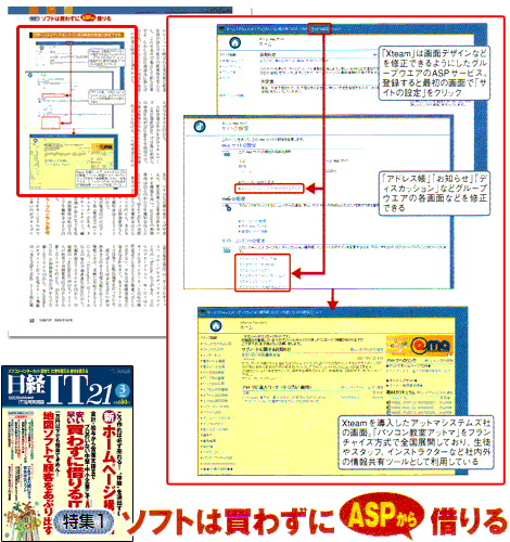 グループウェアが急増 ASPサービスの中で最も多いのがグループウェアだろう。 NTTコムウェアの「ねっとデわーく」やファーストサーバの「サイボウズOffice 4 for ASP」、丸紅の「V-Service」のほか、CRCソリューションズ(東京都江東区)の「Earth Domain」やアスパ社(東京都千代田区)の「アスパラガス」、富士通ビジネスシステム(FJB)の「Web Office」、アクシスソフトウェア(東京都豊島区)の「どこでもオフィス」、グローバルメディアオンライン社の「Xteam」などがある。これらのグループウェア・サービスはiモードなどインターネット対応の携帯電話でも使えるなど機能にほとんど差が無い。それだけに低価格競争に巻き込まれやすく、各ASPサービスでは様様な販売施策を打っている。 〜(中略)〜 グローバルメディアオンライン社もXteamの料金体系を「ライト」「スタンダード」「スイート」の3種類に設定している。ライトは利用者は5人までだが初期費用2980円で月額料金は960円と5人で使えば1人あたり192円しかかからない。スタンダードでは利用者は無制限になり、初期費用1万9800円で月額4900円。50人で使っても1人当たり100円以下だ。同様に利用者が無制限のスイートでは初期費用8万円で月額7万8000円と料金は上がるが、1台のサーバーを貸し出すため利用企業は自由に修正できる。 XteamはマイクロソフトのOfficeXPが備える「シェアポイントチームサービス」と呼ぶグループウェア機能を利用したもの。このためホームページ作成ソフトの「フロントページ」を使えば画面のレイアウトやロゴなどを修正できるほか、Xteam上でワードやエクセルのファイル共有もできる。 |