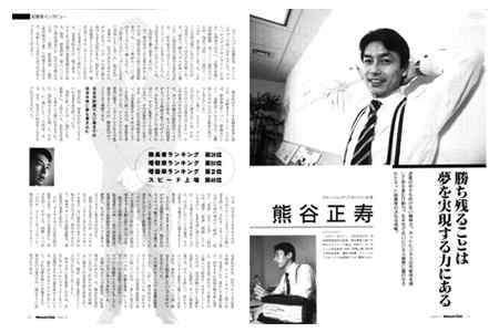 勝ち残ることは夢を実現する力にある ネットバブル崩壊以宋、ネットベンチヤーの扱いはざんざんだ。グローバルノディアオンライン(GMO)も例外ではない。上場半年後には時価総額一兆三○○○億日をつけたが、現在では約一三○憶日と一○○分の一まで落ちてしまった。とかくこの世は移ろいやすいものだが、当事者にとっては大きな打撃となった。「初めて、踏むペダルが重いと感じた」と同社社長の熊谷正寿氏は語る。一昨年前まではマーケットのメインストリームを歩んでいたのに今は厄介者の扱いに甘んじている。 人の行く裏に道あり花の山 今、熊谷氏はこの言葉をかみしめている。同社は昨年六社の企業買収を行った。三○○坪から一二○○坪のオフィスに引っ越しも行った。 (中略) 五五年計画で九〇歳までの未来年表に夢を書き込む 熊谷氏は、将釆自分がどうなりたいか未来年表を作っている。 最初に作ったのは二○歳のとき。結婚もし、子供もいた。高校を中退し、一七歳から父親の仕事を手伝った。通信制の大学にも通った。だから、二○歳にして一人四役。夫、父、学生、祉会人の四役をこなさなければならなかった。 では、自介はどう生きるべきか。一生でやりたいことをすべて手帳に書き出した。それを、ヒラミッド型に書いた図の頂点に「経済」二段目に「家庭」「社会・仕事」三段目には「健康」「教養」「精神」とジャンル分けし、未来年表に藩とし込んだ。三五歳までの年表を作り上げた。自分のしたいことは起業。その会社を三五歳までに上場させようと考えた。 (中略 続く) |
