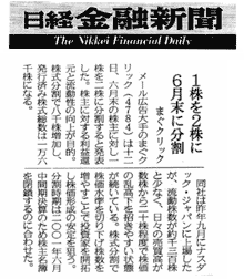 メール広告大手のまぐクリック(4784)は十二日、六月末の株主に対し一株を 二株に分割すると発表した。株主に対する利益還元と流動性の向上が目的。株式分割 で八千株増加し、発行済み株式総数は一万六千株になる。 同社は昨年九月にナスダック・ジャパンに上場したが、流動株数が約千三百株と少 なく、日々の売買高が数株から二十株程度で株価の乱高下を招きやすい状態が続いて いる。株式分割で株価水準を切り下げ株数を増やすことで投資家を開拓し株価形成の 安定を狙う。分割時期は二〇〇一年六月中間期決算のため株主名簿を閉鎖するのに合わせた。 |