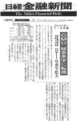 新興企業向け株式市場に上場するインターネット接続事業者(プロバイダー) の七―九月期決算が出そろった。収益構造改革の遅れなどでドリーム・トレイン ・インターネット(4791、DTI)の経常赤字幅が前の四半期に比べ拡大し た一方、グローバルメディアオンライン(9449、GMO)は子会社の組織整 理やコスト削減で経常黒字に転換。ゼロ(4697)は顧客当たり単価の改善で 経常赤字幅が大幅に縮小した。事業構造改革の進展度合いで明暗が分かれた。 GMOの七―九月期は、連結経常損益が二四半期ぶりに黒字転換した。メール 広告やレンタルサーバー関連で相次いで買収した子会社の組織を整理し、グルー プ全体の人員数も削減したことで売上高に占める固定費の比率が低下した。 |