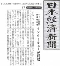 ネット広告表示関連特許権 ◇インターキューは二十一日、九七年十二月に自己破産を申請した旧ハイパーネットが出願したインターネット広告表示に関連する特許権をネット関連サービス会社のエイム(愛知県知立市)から買収したと発表した。インターキユーはネット広告関連サーピスを事業の中核と位置付けている。 既に始めた事業や今後展開するサービスが特許に抵触する恐れがあると判断、買収を決めた。買収したのはインターネット広告表示システム「ハイパーシステム」に関連する特許六件。シンガポールで特許権が成立しているほか、日、米、欧で出願済みという。買収金額は明らかにしていない。 ハイパーシステムはネットに接続した際ブラウサー(問覧ソフト)とは別の窓に広告を配信するのが特徴で、複数の企業が同様の仕組みを利用した広告配信を手掛けている。インターキューは旧ハイパーネットの創業者である板倉雄一郎氏を二十日付で顧問に迎え入れた。 日本経済新聞 1999年12月22日 17面 |