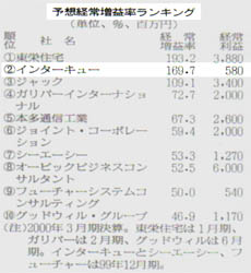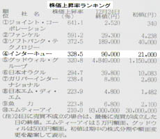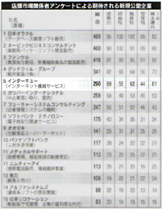 (日経調査の「店頭市場関係者アンケートによる期待される新規公開企業」「株価上昇ランキング」「予想経常増益率ランキング」のそれぞれ上位にインターキューが掲載されました。)