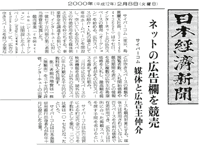 三月中に広告スペースの検索機能を追加。屋外広告などネット以外の広告スペースも競売対象にする。 媒体主は活用されていない広告スペースを有利な価格で有効活用でき、広告主は目的に合った掲載スペースを探す手間を省けるという。 サイバーコムは広告売買による約定代金の二○%を手数料として徴収。二○○○年九月期に五千万円の手数料収入を目指す。第三者割当増資は一株(無額面)を三十万円で評価。インターキユーの出資比率は十○・七%になったという。サイバーコムは日本長期信用銀行出身者らが昨年十月に設立した企業。 日本経済新聞 2000年2月8日 17面 |