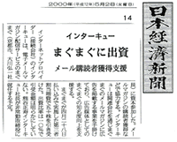 インターキュー まぐまぐに出資 インターネットプロバイダー(接続会社)のインターキューは、電子メールマガジン配信サービスのまぐまぐ(京都市、大川弘一社 長)に資本参加した。メールマガジンの購読者獲得などで協力する。インターキューは関連会社を通じまぐまぐのメールマガジンに広告を掲載する事業を手掛けており、広告媒体としてのまぐまぐの知名度向上を支援する。 まぐまぐが四月二十八日払い込みで実施した第三者割当増資で五十株を引き受けた。出資比率は一○%で引受金額は明らかにしていない。熊谷正寿インターキュー社長が非常勤取締役に就任する予定。 |