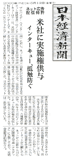ネット広告配信特許 米社に実施権供与 ◇プロバイダー(インターネット接続業者)のインターキューは十一日、米国の無料プロバイダー大手、ネットゼロ(カリフォルニア州)に対し、ネットを通じた広告配信など米国で申請中の特許の実施権を供与することを決めた。ネット接続している端末の画面上に自動的に広告を表示する仕組みが中心で、広告収入に頼るネットゼロが特許成立後に抵触する可能性があると判断した。日本のネット関連の特許実施権を米国企業に供与するのは珍しい。 供与するのは利用者の属性に応じた広告を配信する技術や、利用者が広告表示を拒んだ場合に回線を切断する技術など、六種類の申請中特許。米国とカナダの占有実施権を供与する。供与料は明らかにしていない。ニチメンが仲介した。申請中の特許は一九九七年に自己破産を申請したハイパーネットが出願したもので、昨年十二月にインターキューが特許権を買収した。日本とシンガポールでは一部が成立している。 ネットゼロは昨年九月に米店頭株式市揚(ナスダック)に公開しており、接続会員数は約四百万人。 |