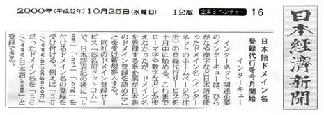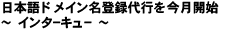 インターネット関連企業のインターキューは、ひらがなや漢字など日本語を使 ったドメイン名(インターネットのホームページの住所)の登録代行サービスを 十月中に始める。これまでローマ字や数字などしか使えなかったが、ドメイン名 を管理する米企業が日本語のドメイン登録を認めたことを受け新規参入する。 同社のドメイン登録サービス「お名前ドットコム」で、日本語表記の後に「.com」「.net」 「.org」を付けるドメイン名の登録を受け付ける。例えば「http://www.nihongo.com」だったドメイン名を「http://www.日本語.com」と登録できる。 |