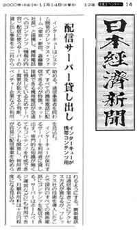 インターキューはシステム開発のフレックス・ファーム(東京・新宿、斎藤徹社長)と提携し、携帯電話へのコンテンツ(情報の内容)配信に使うサーバーの貸し出し事業を十二月から始める。通信事業者を問わず、すべての携帯電話に配信できるのが特徴。ネット接続できる携帯電話が急速に普及しているためサーバー需要が拡大すると判断、ベンチャー企業などの利用を見込む。 インターキューが保有するサーバーを利用者に貸し出す。専門的な知識が無くてもコンテンツを作成できるソフトも開発し、利用者が容易に配信事業を始められるようにする。携帯電話は通信事業者ごとにアクセス方式が異なるが、フレックス社の技術を導入したことで国内のすべての携帯電話にコンテンツを配信できる。サーバーはホームページ運営などにも利用できる。月額利用料は十万円程度になる見込み。 |