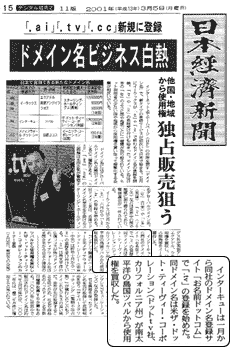 インターネット上でホームページ(HP)の住所を表す「ドメイン名」で、新タイプの登録サービスが相次いで日本で始まる。五月にイーラックスが「.ai」 「.ec」で終わるドメイン名の登録を開始。「.tv」 「.cc」 の登録受け付けも始まった。ドメイン名は日本の「.jp」のように国や地域ごとに一種類が割り振られている。ネット利用者の少ない国や地域から使用権を買い取って商業化する企業が相次いでいる。 ドメイン名にはグローバルドメイン名と国別ドメイン名の二種類がある。「.com」 「.net」 「.org」 の三種類は米国企業が管理するグローバルドメイン名。「.jp」(日本)や「.uk」(英国)「.fr」(フランス)などは世界中の国や地域に割り振られており、管理運営が一任されている。 |