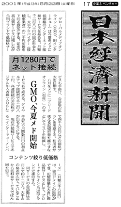 月1280円でネット接続 グローバルメディアオンライン(GMO、旧インターキュー)は今夏をメドに低価格のインターネット接続サーピスを始める。月額千二百八十円の固定料金とし、大手プロバイダー(接続事業者)の二干円前後を下回る設定にする。従来の高品質サービスは残しながら別プランドで低価格サービスも手掛け、会員数の拡大を目指す。 八月をメドに「プロードオンライン(仮称)のサービス名で始める。ダイヤルアップ接続型で干二百八十円、高連接続の非対称デジタル加入者線(ADSL)で四干九百円などの価格プランを用恵する。利用者が便える記憶容量を滅らすなどしてコストを削滅し、一 件あたり月間数百円の利益が出るようにする。 現在の接続サービスである「インターキューメンバーズ」(月額三干八百円)は、独自ドメインの取得ができ、記憶容量も大きい高品質サービスとして、プロードオンラインとは別プランドで運営する。同サービスの会員数は三月末で約十二万人。大手との格差が広がっていることから低料金サービスでぱん回を狙う。 |