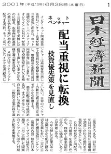 ネットベンチャー 配当重視に転換 インターネット関連事業を営むベンチャー企業が配当を重視し始めた。ネット接続のグローバルメディアオンライン(GMO)が前12月期に初めて実施したのに続き、仮想商店街運営の楽天なども今期に初めて配当する方針。ネット系ベンチャーは高成長を目指して企業買収や投資を優先し、増資資金や期間利益は内部留保に回してきた。有力な投資先が乏しいうえ株価が下落していることから株主還元策を見直す。 米国ではマイクロソフトやサン・マイクロシステムズ、オラクルなどハイテク企業は配当していない。日本のベンチャーの新たな株主政策は「米国モデル」から転換する。 |