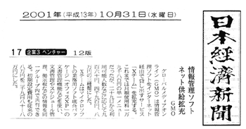 情報管理ソフト ネット供給拡充 グローバルメディアオンライン(GMO)は情報管理ソフトをインターネット経由で賃し出すサービス「Xチーム」を拡充する。 これまでは月額便用料一万九干八百円の単一メニューだったが、二十九日から利用可能人数などに応じて九百六十円、四千九百円、七万八千円*の三種類にした。 Xチームはマイクロソフトの業務用ソフト統合パッケージ「オフィスXP」の文書管理機能などを使い、又書管理やスケジュール管 理、掲示板などの情報を同ーグループ内で共有できる。初期設定費用も従来の八万円を二干九百八十〜八万円にした。 * 新聞記事中にて月額利用料「八万円」とありましたが、正確には七万八千円です。 |