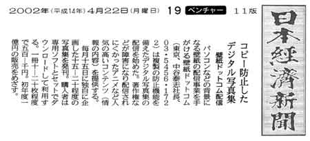コピー防止したデジタル写真集 壁紙ドットコム配信 パソコンなどの背景になる壁紙の配信事業を手がける壁紙ドットコム(東京、中谷泰志社長、03・5456・1722)は複製の防止機能を備えたデジタル写真集の配信を始めた。著作権などが障害になり配信されにくかったアニメなど人気の高いコンテンツ(情報の内容)を提供する。 毎月十五日に独自に企画した十五−二十程度の写真集を発刊。購入者は専用ソフトとセットでダウンロードして利用する。一冊十−二十枚程度で五百−千円。初年度一億円の販売をめざす。 |