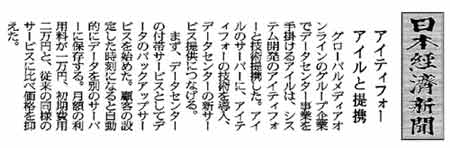 アイティフォー、アイルと提携 グローバルメディアオンラインのグループ企業でデータセンター事業を手掛けるアイルは、システム開発のアイティフォーと技術提携した。アイルのサーバーに、アイティフォーの技術を導入、データセンターの新サービス提供につなげる。 まず、データセンターの付帯サービスとしてデータのバックアップサービスを始めた。顧客の設定した時刻になると自動的にデータを別のサーバーに保存する。月額の利用料が一万円、初期費用二万円と、従来の同様のサービスに比べ価格を抑えた。 |
