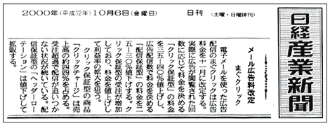 電子メールを使った広告配信のまぐクリックは広告料金を十一月に改定する。 実際に広告が閲覧された回数に応じて料金を決める「クリック保証型」の料金を 三五 ― 四〇%値上げし、広告配信数で料金を決める「配信保証型」の料金を 二五 ― 三〇%値下げする。クリック保証型の受注が増加しており、料金を値上げして利益率の拡大を狙う。 クリック保証型の商品「クリックチャージ」は売上高の約四四%を占める。受注超過で配信が追いつかない状況が続いている。配信保証型の「ヘッダーローテーション」は値下げして拡販する。 |