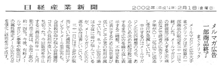 メールマガジン広告大手まぐクリックは不採算の一部商品の販売を三十一日で終了した。メールマガジンの冒頭部に挿入する広告商品などで読者の広告クリック率が〇.二%以下に低迷し受注が急減していた。 中止するのはメールマガジン広告四種類のうち、あらかじめ決めた配信数に達するまで広告を繰り返し表示する二種類。不特定多数に表示するため広告効果が低いとして企業の利用が減っていた。ネット広告市揚は全体に伸び悩んでいるが、メールマガジン広告の落ち込みは著しいという。 三十一日には子会社が賑売していた携帯電話向けダイレクトメール型広告も、会員数が伸ぴ悩み会員獲得コストの負担が重いため打ち切った。今回販売を中止する三商品の昨年一 - 九月期の売土高は、全売上高の約一四%。今後、有料メールマガジン事業や販促向げの属性指定メール広告などを強化し経営を立て直す。 |