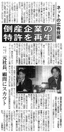 そこで、熊谷社長は、プロバイダーがバイパーシステムを使って、画面の一角に常に広告を表示できるようにすることを提案している。「そうずれぱ広告 収入はプロバイダーに入り、利用者料金の値下げにもつながる」という。熊谷社長は、ハイパーシステムの特許技術は無償提供し、各社が獲得する広告の手数料を頂く、という作戦だ。 熊谷社長は今回の事業化に向けて、用意周到に準備してきた。三十七歳と同い年で「旧知の仲」という板倉氏をインターキューの顧問として迎え入れた。 板倉氏は会社倒産直後に自身も二十六億円の負債を抱えて自己破産したが、その後はてんまつを記した「社長矢格」などの著書がヒットし、"ベンチャー評論家"として講演会も精力的にこなしていた。 事業計画を発表した先月三十日の記者会見に同席した板倉氏は、「当時は、ネット人口も少なく、広告を配信したい会社も少なかった。それに(私のように)経営能力のない人物が社長だったために倒産した。今回は違うはず」と、最前線復帰に嬉しそうだった。 この特許をめぐる裁判がさきごろ米国で開かれ、インターキューの提携先会社が勝訴した。この特許が大化けする可能性もある。 (高原秀己) |