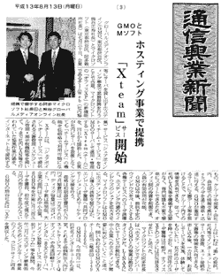 ホスティング事業で提携 グローバルメディア才ンライン(GMO、東京都渋谷区、熊谷正寿社長)とマイクロソフト(東京都渋谷区、阿多親市社長)は七月三十日、企業等にサーバを貸し出すホスティンク事業で業務提携を行うことで合意。マイクロソフトの「才フィスXP」の新機能であるチームWeb(社内協業)サーピス「シェアボイント・チーム・サーピス」をGMOのサーバ上で適用・管理する「X team(チーム)」を、同日から閉始した。企業が社内にサーバを設置しなくても「チームサーピス」の機能を低価格で利用可能になる。 Xチームは、「シェアボイントチームサービス」で提供される文書管理・スケジュール管理・掲示板機能等を用いて、今まで社内LAN等で行われていた協業作業の場を、インターネット上で提供するもの。 |