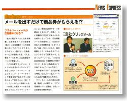 新サービス プライベートメールが広告媒体になる!? 個人の電子メールに広告を掲載。広告掲載メールの送信者(個人)は広告掲載メールの送信数に応じてポイントがたまり、 そのポイント数によって商品、サービスが捉供される。そんな、電子メールを用いた広告配信サービスが登場した。 この広告配信サービスは、ダイヤルQ2を用いたプロバイダでおなじみのインターキュー、およびネットワーク・マーケティング事業会社 であるアランの2社によって設立された(株)クリックメールにより提供される。 一般個人の電子メールを広告媒体とするこの「クリックメールは、専用のSMTPサーバを経由させることで、 送信メールに白動的に広告文が挿入される仕粗みになっている。広告掲載メールの送信者には、広告主が支払う広告掲載料金(0.8〜1.5円/1通)の20〜30%が、媒体報酬として、 いわゆるポイントというかたちで加算される。たまったポイントは、「interQ MEMBERS」の接続料に利用できたり、あるいは商品券などと交換できるようになる予定だ。 |