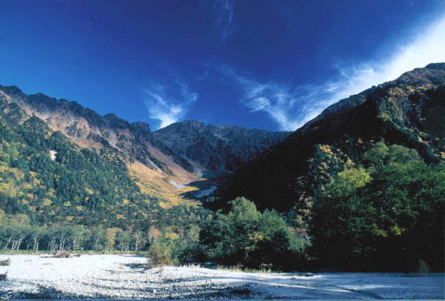 秋の上高地の写真です。奥に見えるのは穂高です。とても空の青が綺麗な朝でした。(7時位だったと思います。)