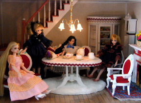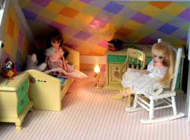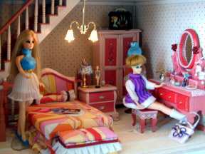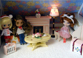 3つライトのシャンデリアです。 Doll達も、着替えての登場です。ほんわかと 柔らかい光です。(*^^*) 暗いのでなかなか細部まで見えませんが この部屋も、もう少し小物が増えるかも・・・ |