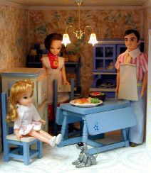 こちらはキッチンです。ミミちゃんは、 お食事前にアイボと遊んでいます。 (このアイボはシャープの芯のおまけです) |