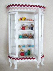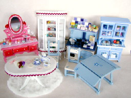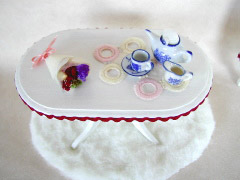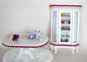 私は、ソファーをそのままのキットで 製作したので、イスの色に合わせて えんじのジャバラのリボンを飾り付け に使いました。キャビネットの中には、 花瓶や置物などを適当にイメージして 置いてみました。 テーブルの上にはティーセットと 花束。カーペット代わりに フアーを丸く切り毛足を短くカット して使用。 う〜〜〜ん、もっと大きくして椅子も 全部置けるようにしようかな。。。 |