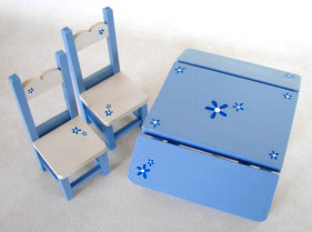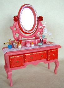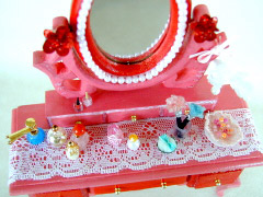 続いては色を塗った時点で「ど〜〜なる 事かっ!?」と思っていた(爆)ドレッサー 引き出し部分の縁には、ゴールドのラメを 付け、鏡の周りにはスパンで出来たお花と パールビーズを飾りました。 化粧瓶やパフ、マニキュアなどの小物を 作りレースを敷いて並べました。 |