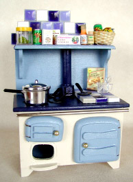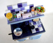 キッチンのクッキングストーブです。 レトロなデザインなのですが色を変えて 1cmタイルを使い,ちょっぴり 今風に見えるようにしてみました。 棚の上には調味料などを並べ お鍋も付属の物は使用せずに現代の デザインの物を置きました。 |
