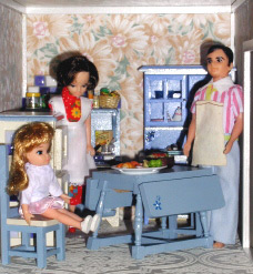こちらには、「ミミちゃんのラブラブファミリー」です。 パパとママとミミちゃんの3人が入ると 狭いわぁ〜〜(笑) でも、丁度パパもママもエプロン姿なので キッチンにはピッタリ! テーブルの上には、サラダやパンなどを置き これから食事?って感じかなぁ〜(*^^*) |