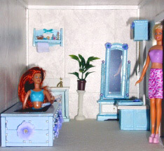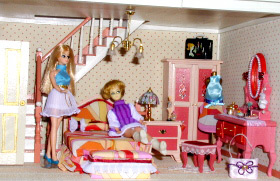 ここは寝室だった所ですがDawnのお部屋に なりました。しかも、シャンデリアも付き 電気が付きます。どうやらDawnはバービー コレクターのようです。お部屋のあちこちに バービーアイテムを飾りました(笑) |