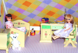 ヨ この部屋の家具は、元々子供部屋になるハズ だった家具なので、小さめにできてます。 だから、ここに済むDollも小さい「キラキラ セーラ」に住んでもらいました。 |