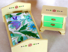 ベッドとチェストです。 こちらのお花模様も、水で貼るタトゥシール。 机も同じ柄を使用して統一しました。 |