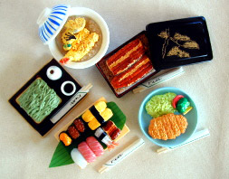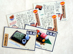 訪れました。2002年の夏には、 こんな物まで登場! 300円のラムネ菓子ですが、ラムネは 申し訳程度に付いていて、買う側の狙いは オマケです。(しかも、大人が狙ってます) 種類は5種&シークレット! 300円にしてはなかなかの出来です。 1/6サイズのお人形にも使える感じ。 中には本当の料理のレシピが書いてある カードも付いています(^_^) ※食玩=(子供が買う様なお菓子にとても精巧な ミニチュアフィギュアなどが付いているもの) |