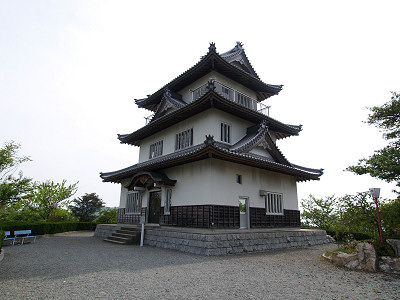 そこからさらに山頂部の南の端に行くと、今回の目的だった天守風の展望台・資料館が有りました。