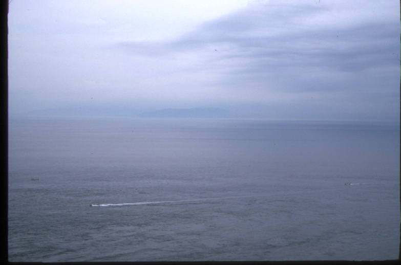 石川さゆりの大ヒット曲「津軽海峡冬景色」の歌碑です。2番の歌詞に龍飛岬がでてきます。 津軽海峡です。むこうの方にかすかに北海道が見えます。 小さな漁船が往来していました。 |